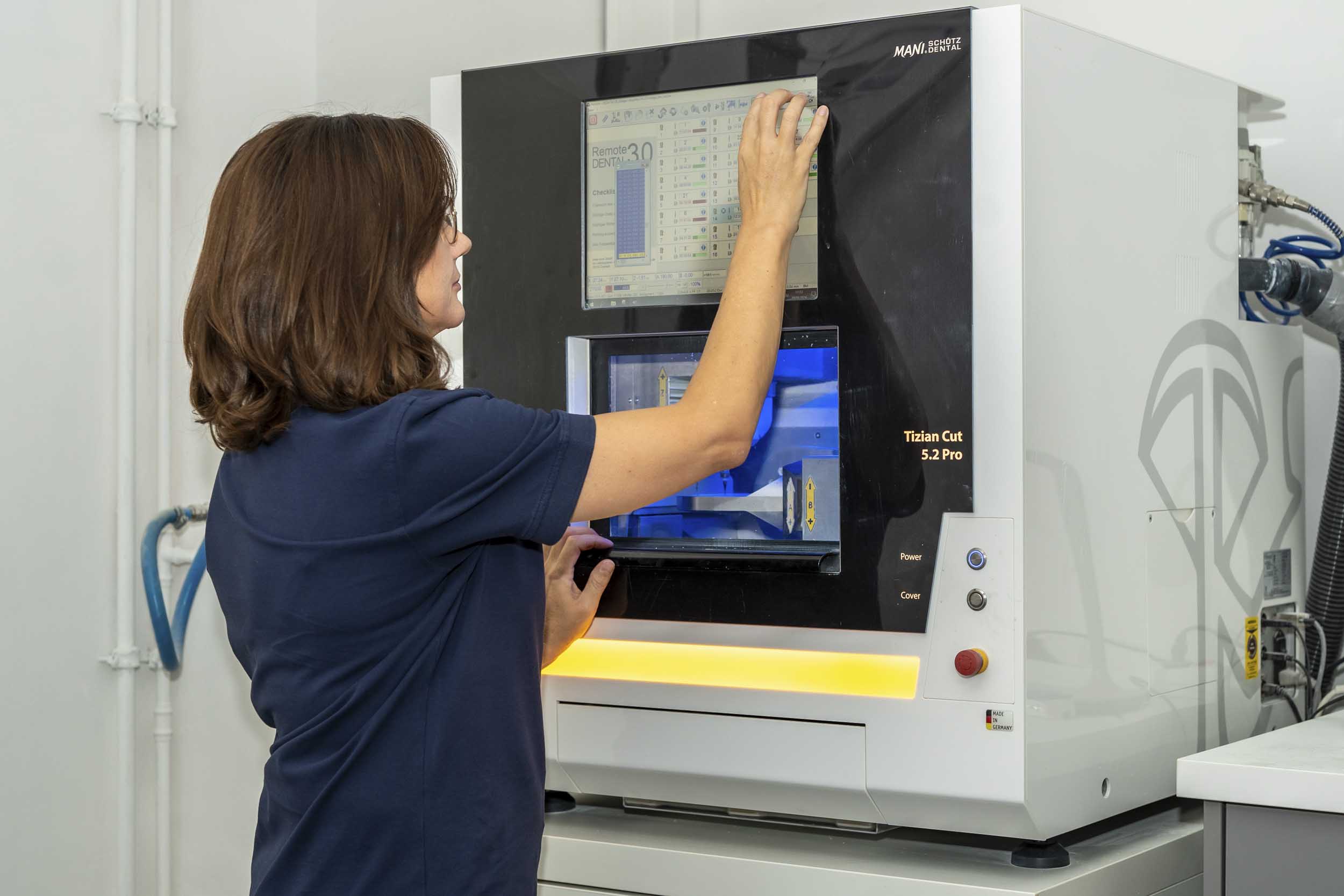 Ebenso ist eine kurzfristige Anfertigung von ästhetischen Langzeitprovisorien aus zahnfarbenen PMMA-Fräsblanks für den Frontzahnbereich möglich. Wir fertigen den Zahnersatz in Zusammenarbeit mit spezialisierten Fräszentren an.