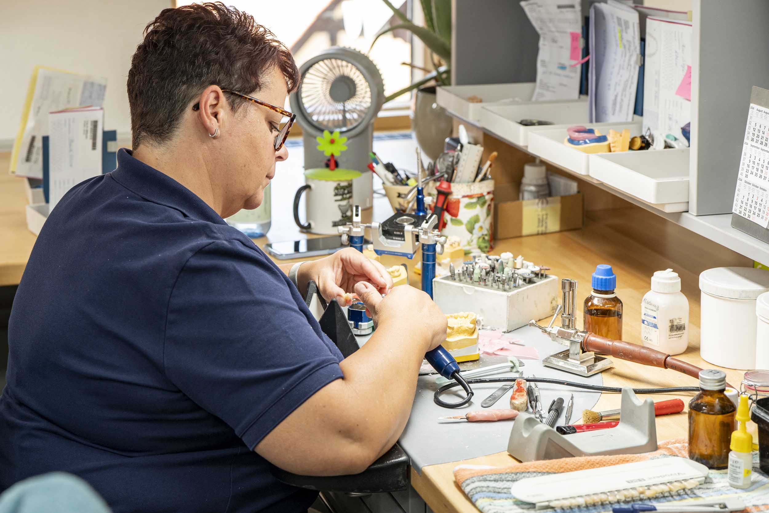 Wir fertigen Einzelkronen, Brücken oder Prothesen aus Metall, Keramik oder Kunststoff (PMMA/PEEK) – je nachdem, welches Material Sie und Ihre Patien:innen für die jeweilige Behandlungssituation bevorzugen. Bei implantatgetragenen Totalprothesen besteht für einen besonders angenehmes Tragegefühl außerdem die Möglichkeit der gaumenfreien Herstellung.